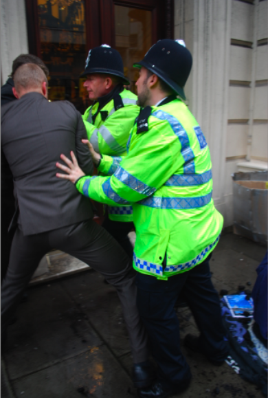 Police push an activist away from dumping coal on a woman as part of a street theatre. They believed they really were GCM execs!