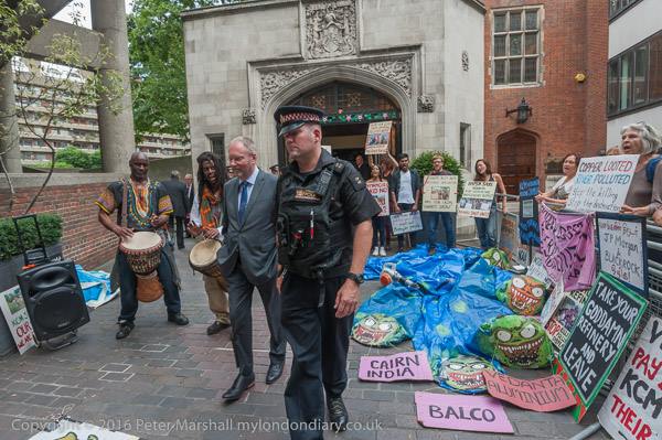 A board member – Anil Agarwals family member needed to be escorted by British police as protesters were angry against Agarwal family for destroying communities . Photocredit: Peter Marshall across the south Photo by Peter Marshall