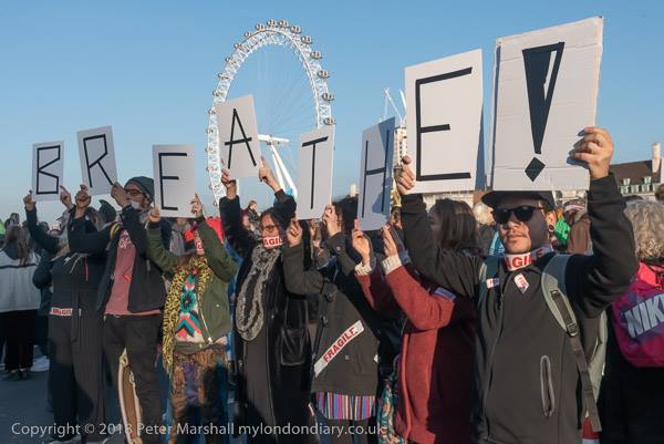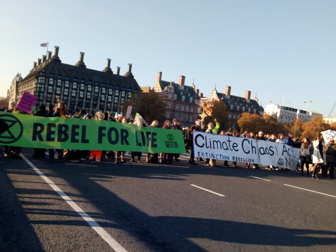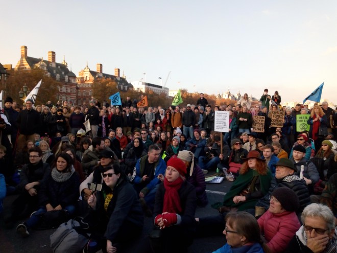 From the morning 10am through late afternoon 5pm on the Rebellion Day more than 6,000 people have occupied five bridges in central London “to raise the alarm on the climate and ecological crisis – and to put pressure on the Government to come clean on the fact that there is a climate emergency”. A press release by the Extinction Rebellion notes “This is the first time in living memory that a protest group has intentionally and deliberately blocked the five iconic bridges of central London”. The blocked bridges include Southwark, Blackfriars, Waterloo, Westminster and Lambeth. Police have put signal blockers in place to prevent live streaming. There have been 22 confirmed arrests of protestors. People have willingly put themselves at risk of arrest and imprisonment to ensure that this cause is brought to the public’s attention.